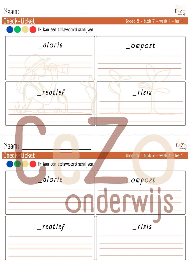Een check-ticket is een bladzijde met vier korte opdrachten die direct aansluiten bij het lesdoel van de volgende spellingles. De leerlingen maken dit blad een dag van tevoren. Het invullen van het check-ticket geeft jou als leerkracht meteen waardevolle informatie. Je ziet vooraf al wie de categorie begrijpt, wie nog twijfelt en wie het nog niet beheerst. Op basis daarvan kun je keuzes maken voor de les die je de volgende dag gaat geven.